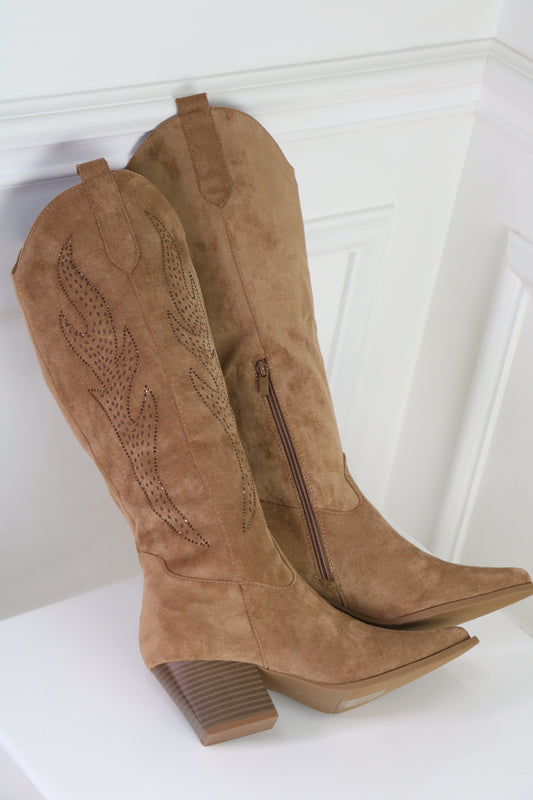 Bottines Santiag Style Western Cowboy Taupe à Strass, Talon Bas - Sélection Halloween