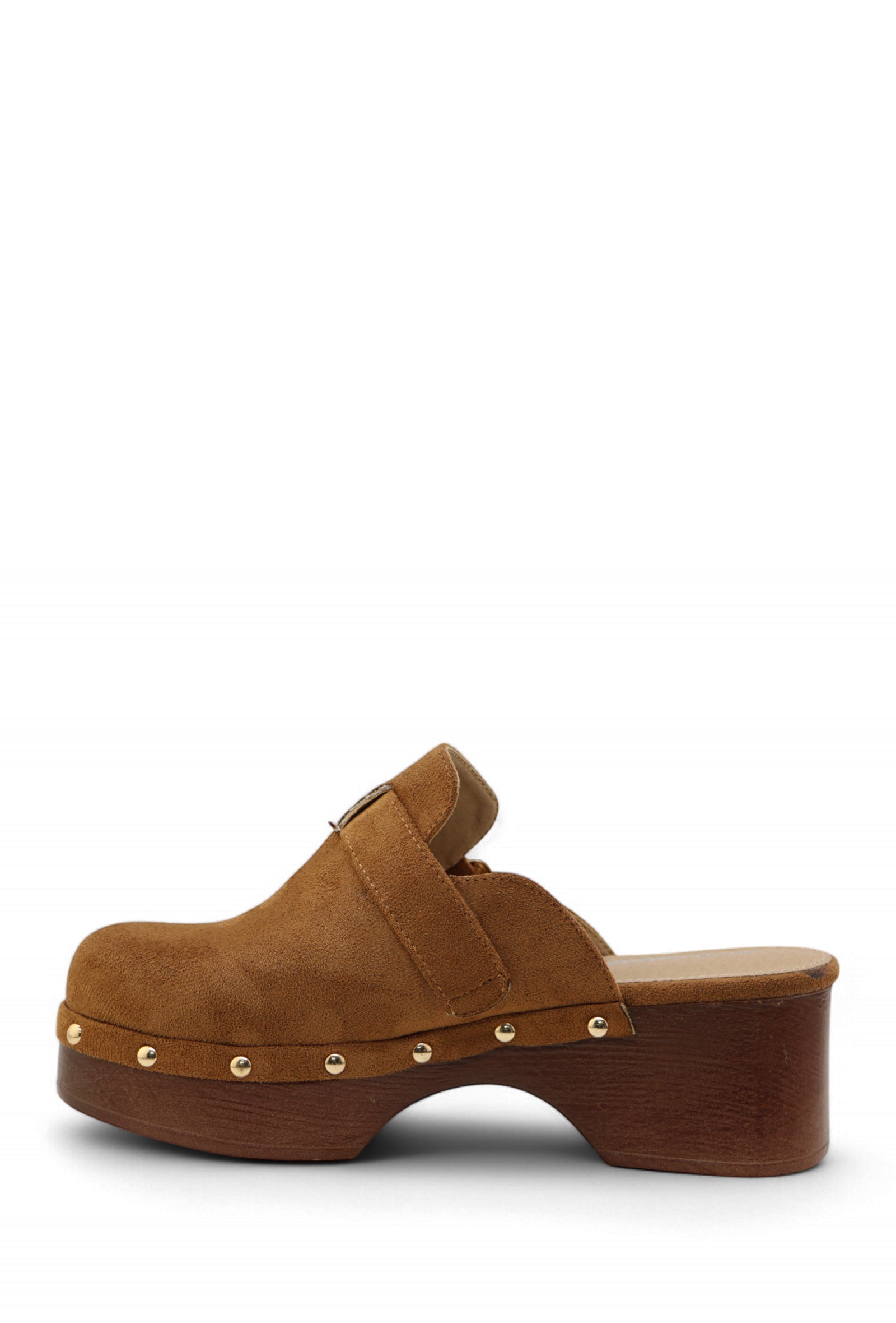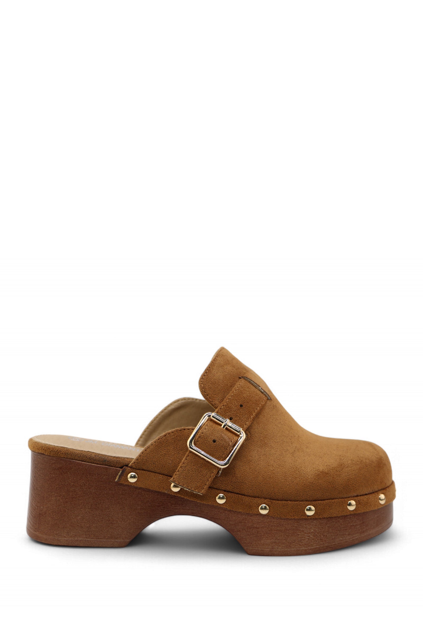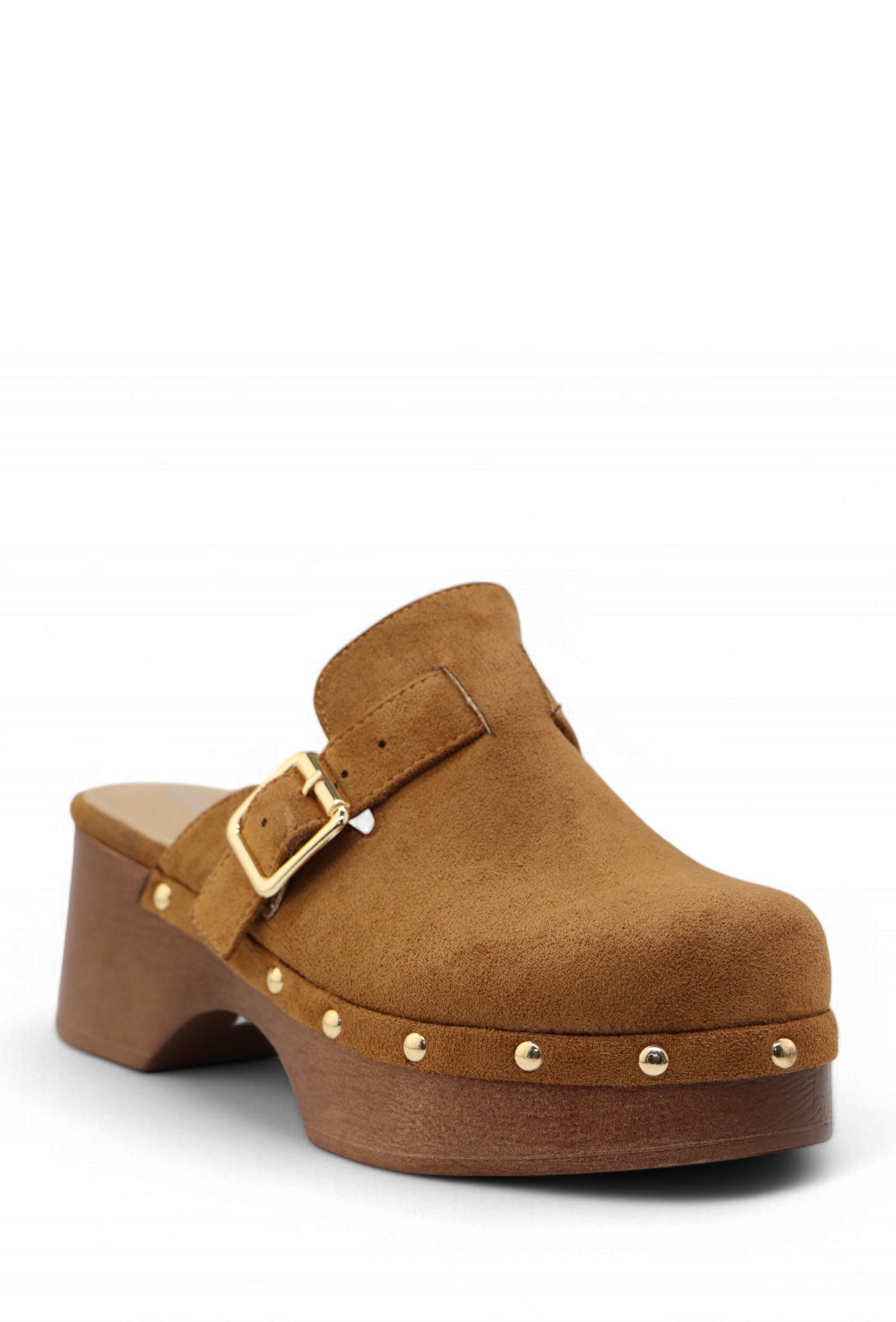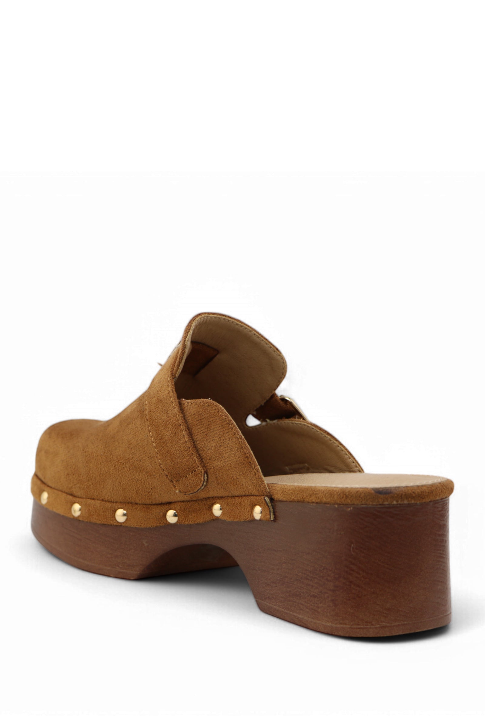 Sabots Suédine Camel à Plateforme Effet Bois Cloutée avec Boucle Métal
