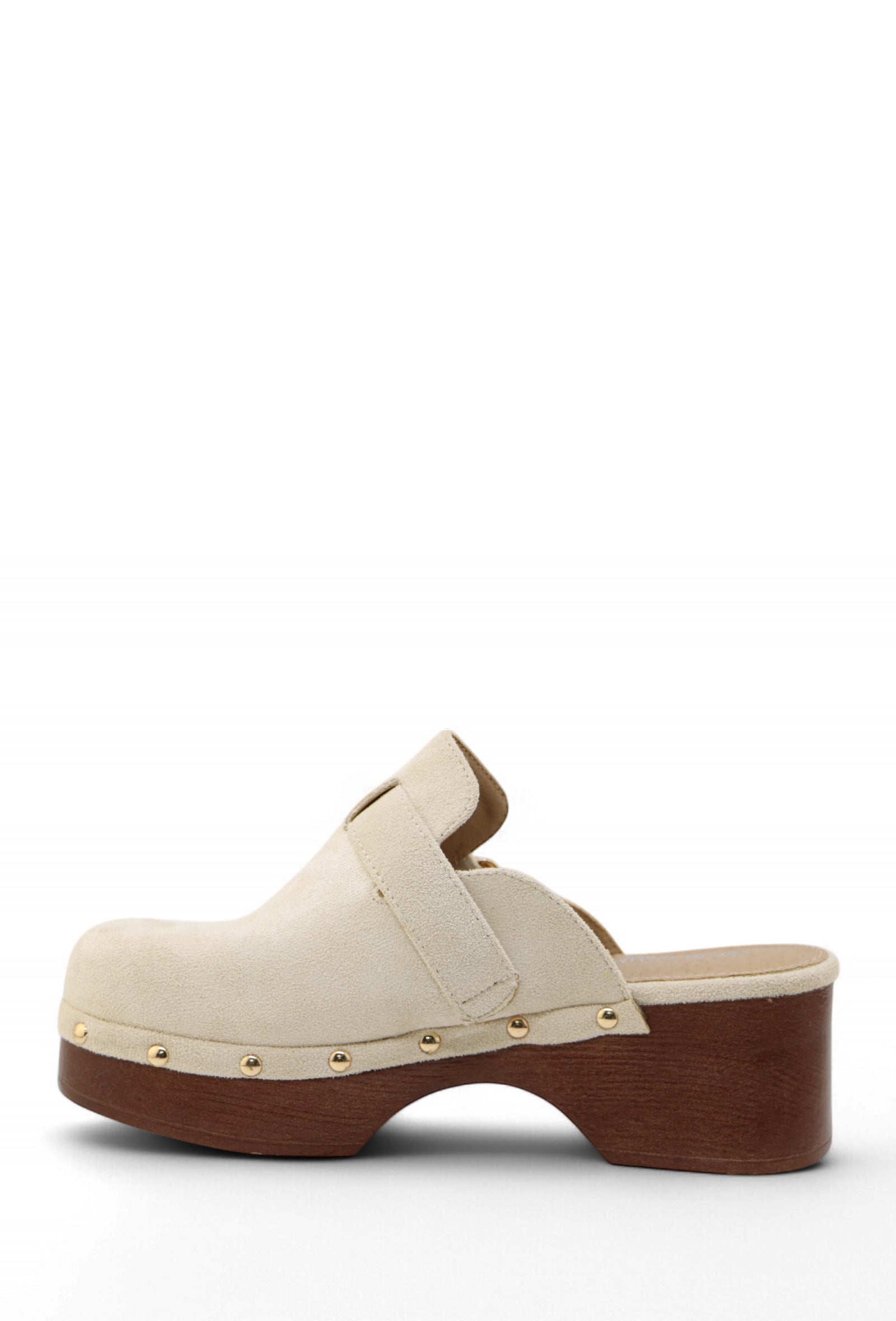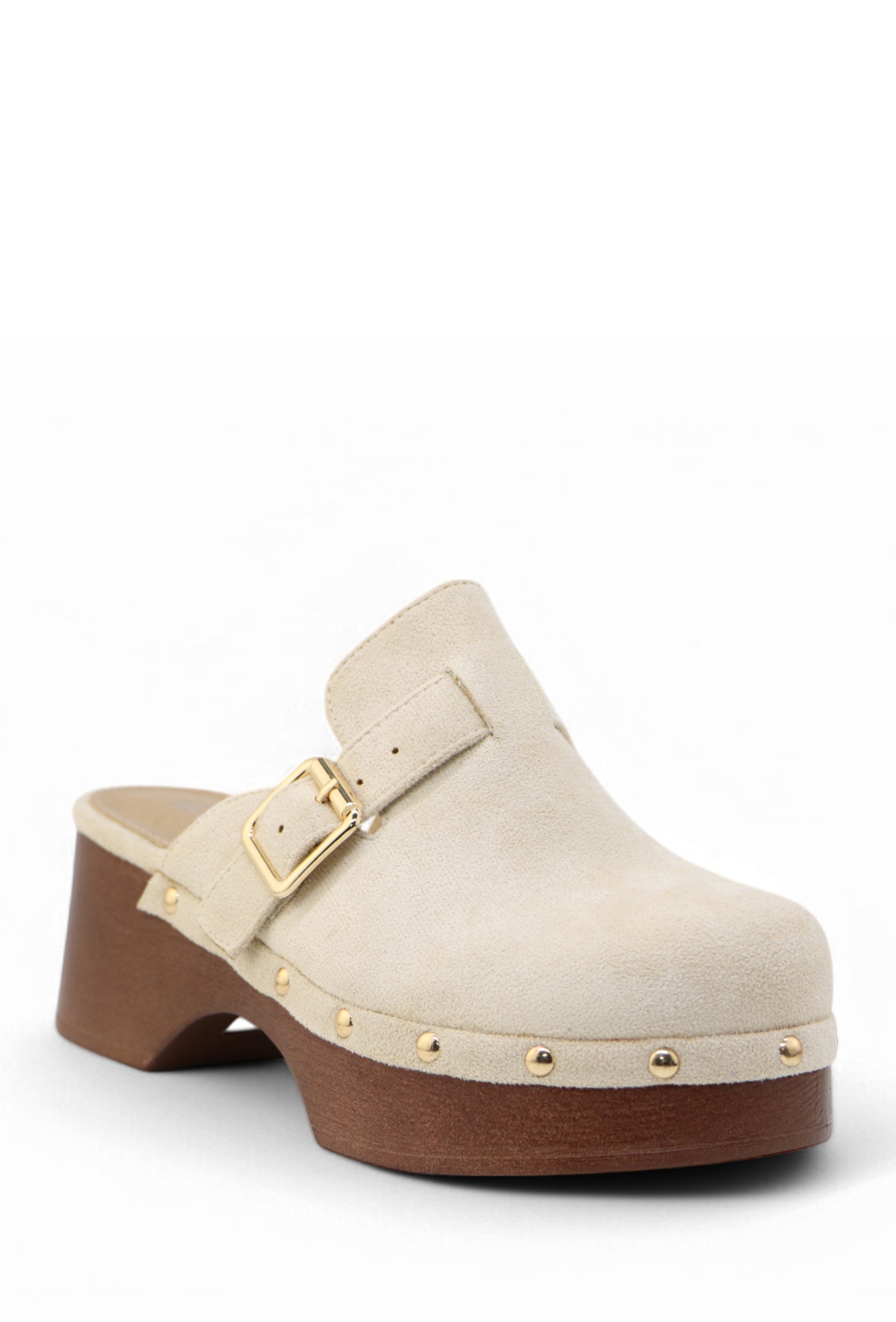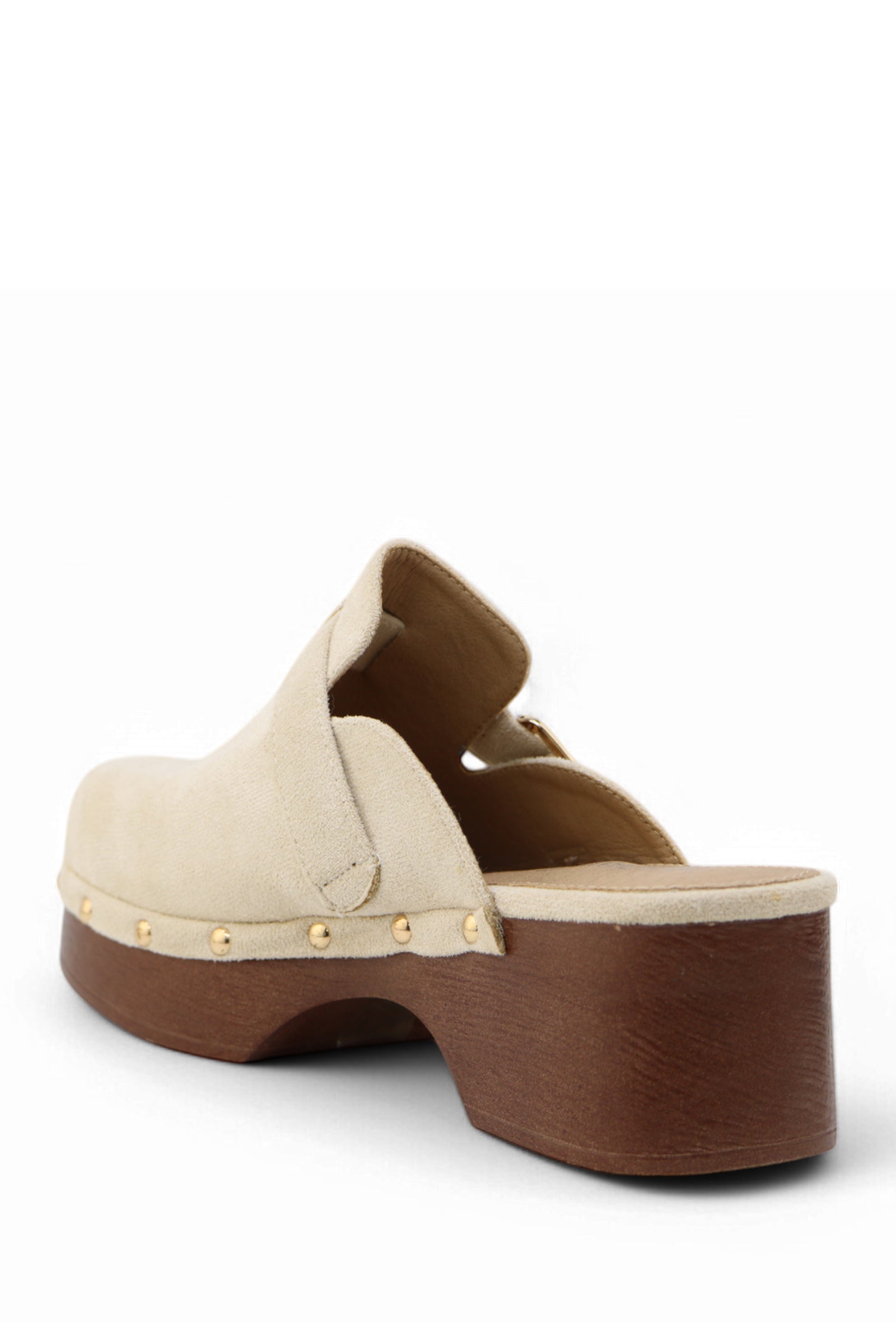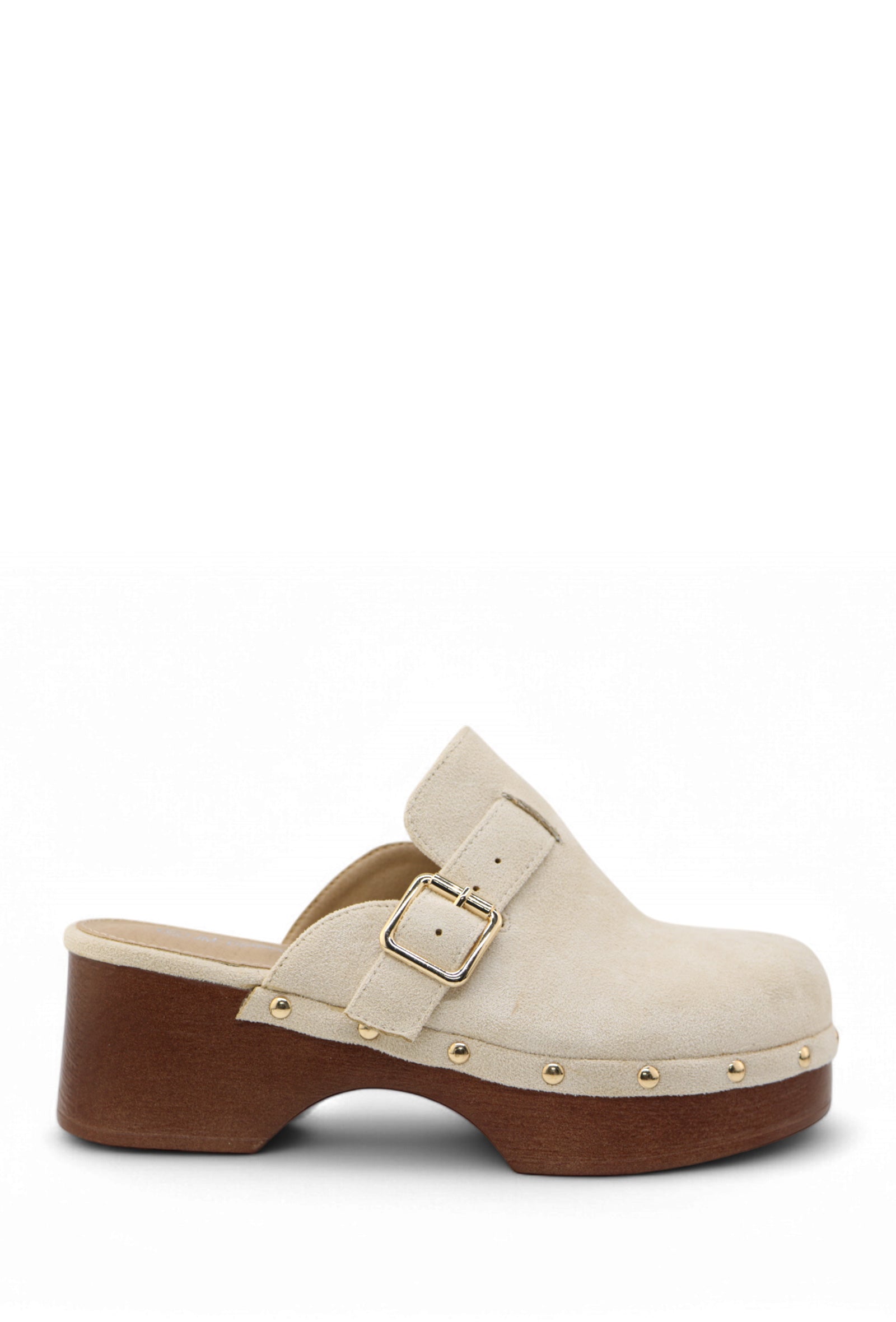 Sabots Suédine Camel à Plateforme Effet Bois Cloutée avec Boucle Métal