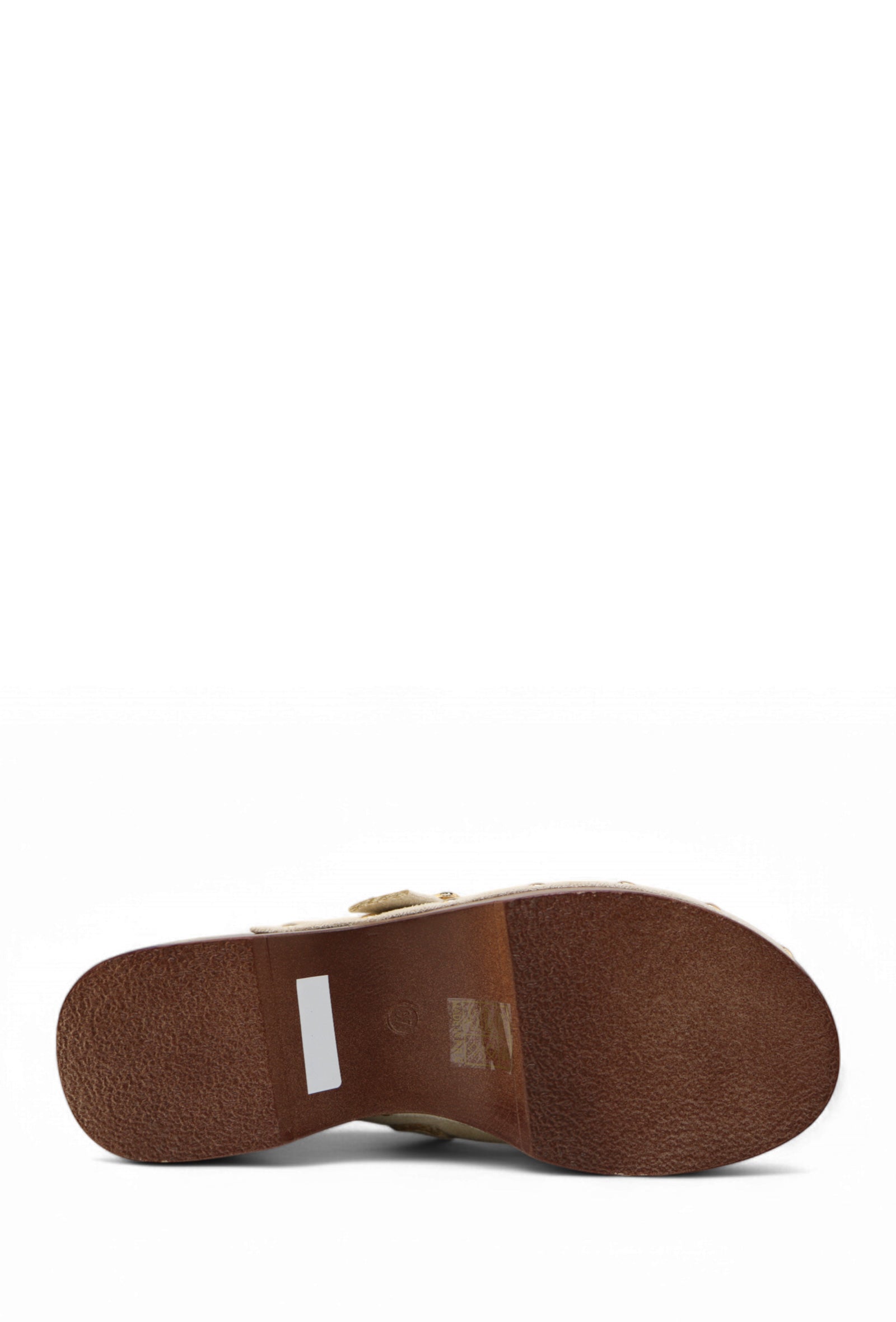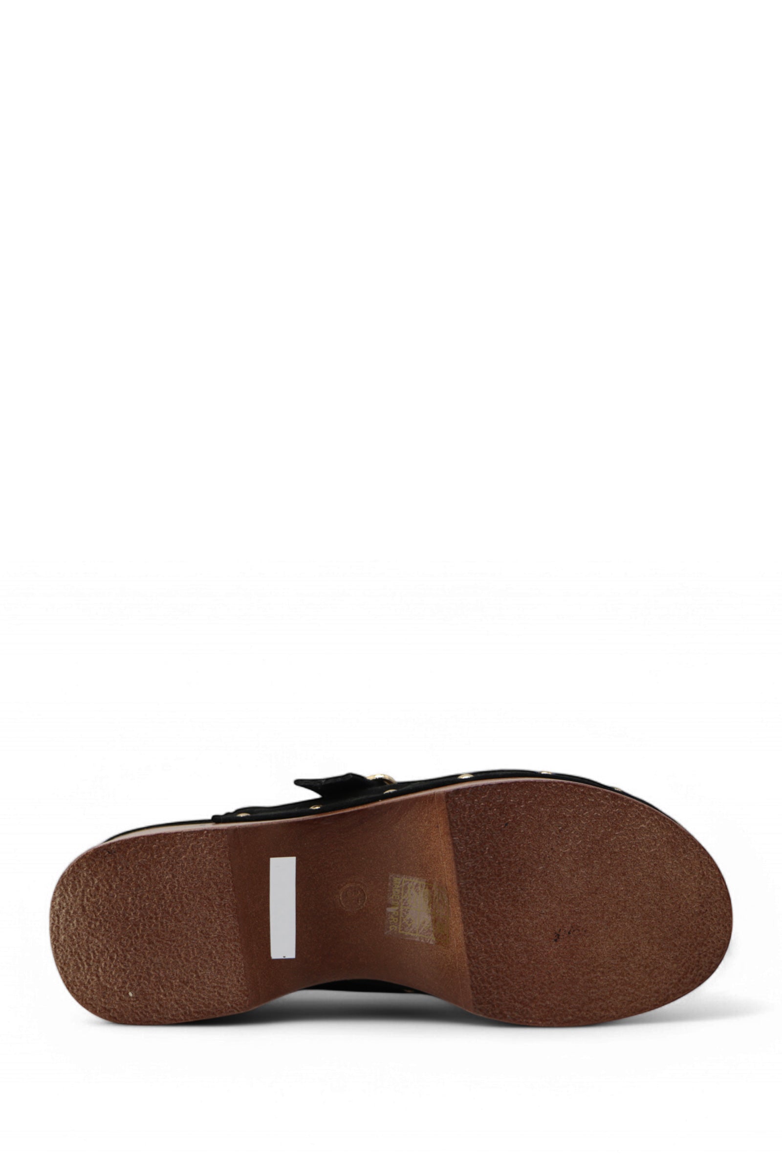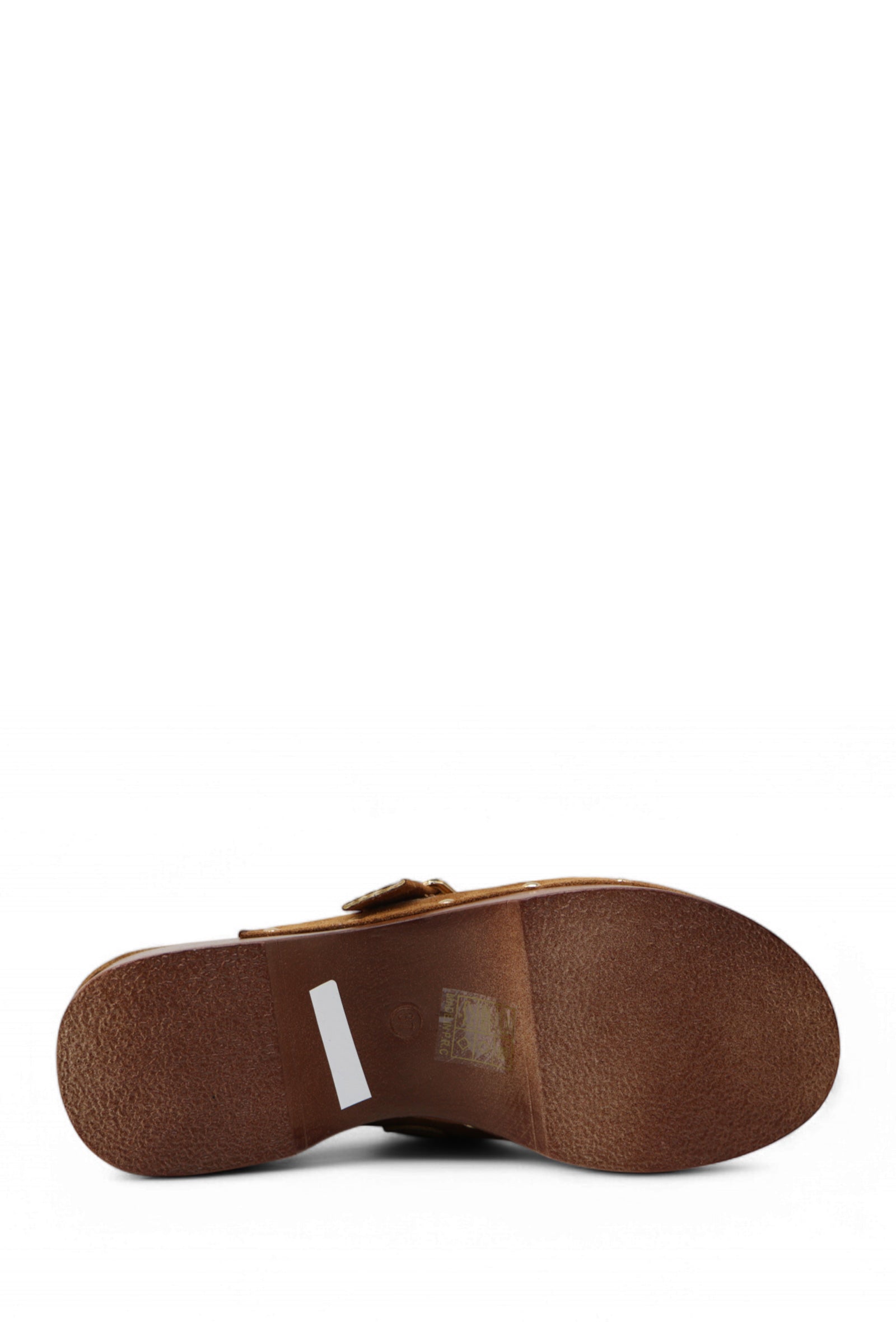 Fermeture : Mule/Sabot (à enfiler, pas de fermeture arrière) ; Bride décorative sur le dessus avec boucle ardillon métallique (réglable ou purement décorative).