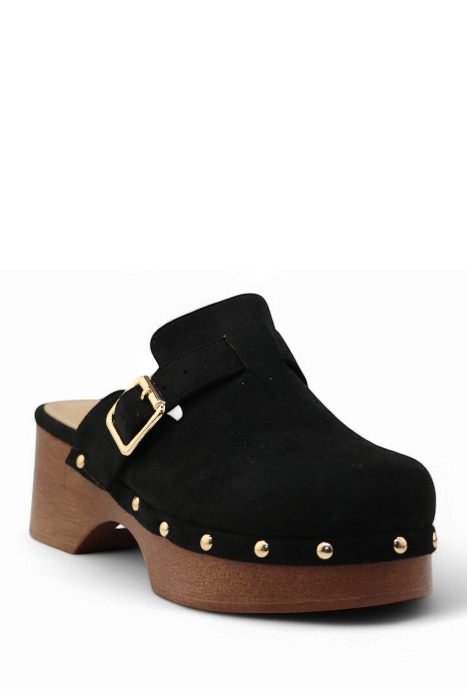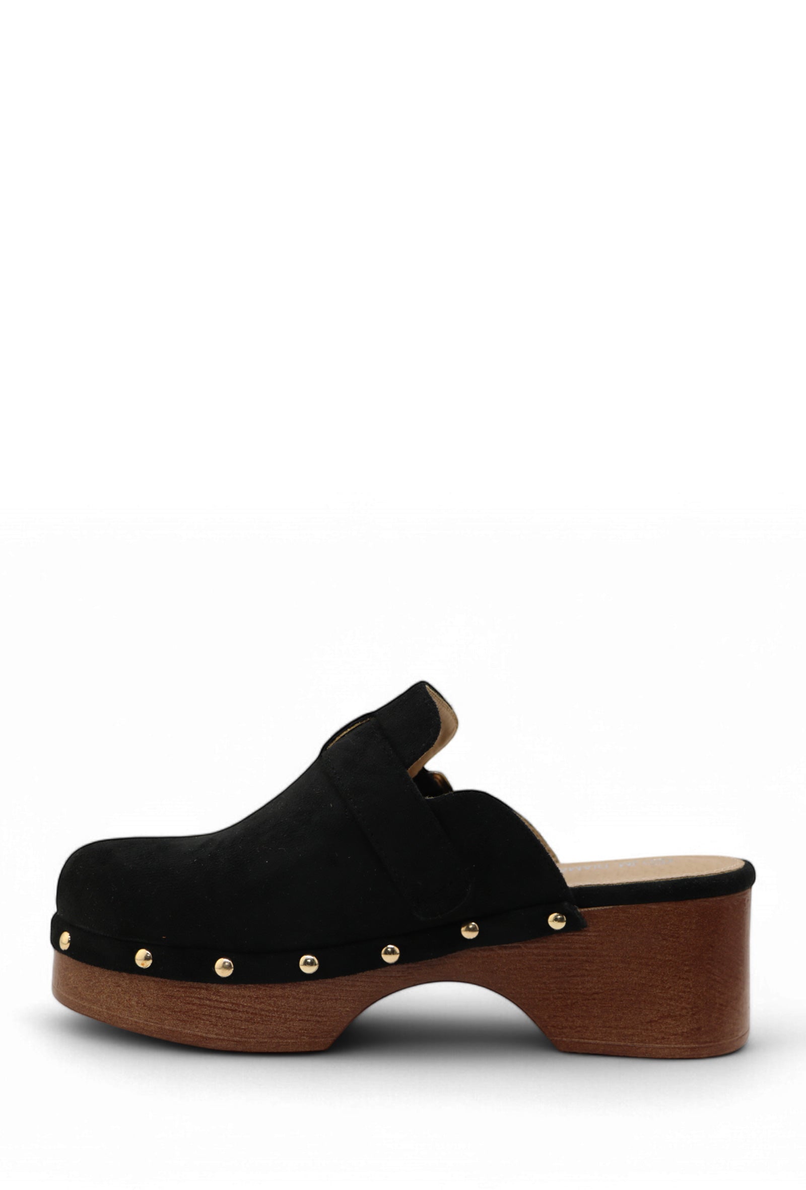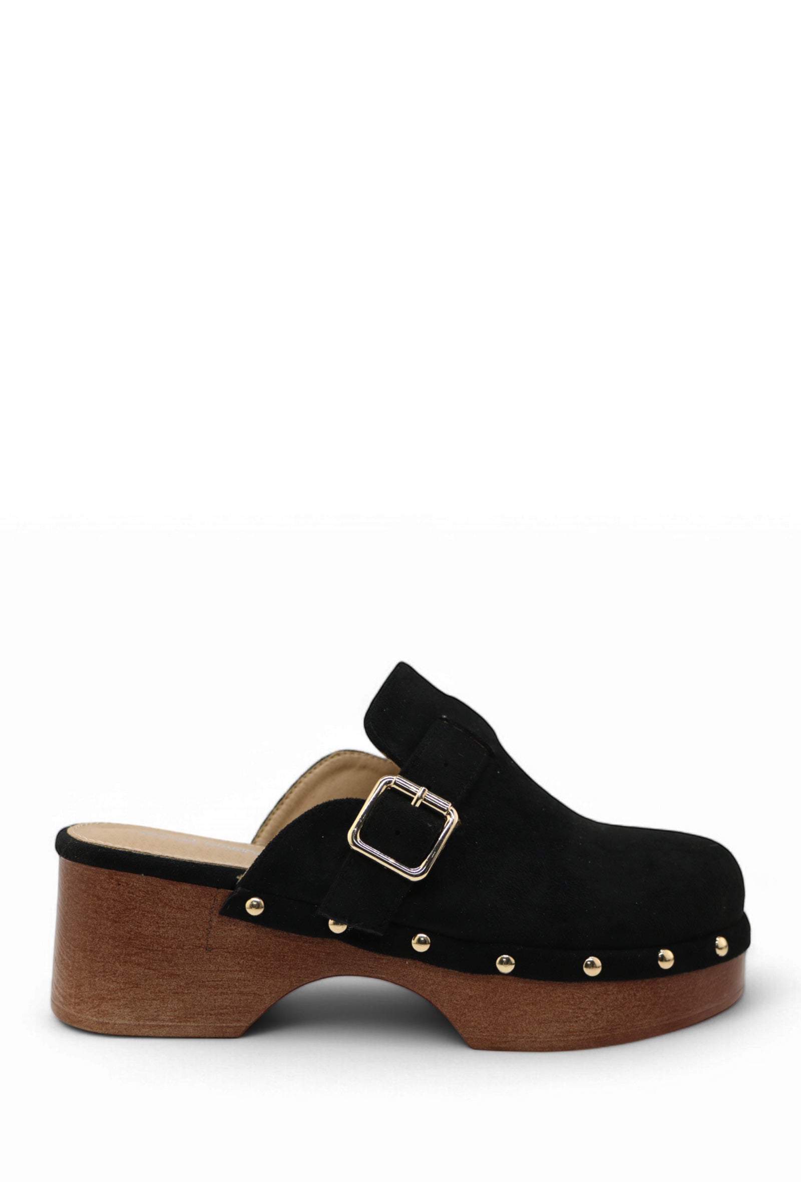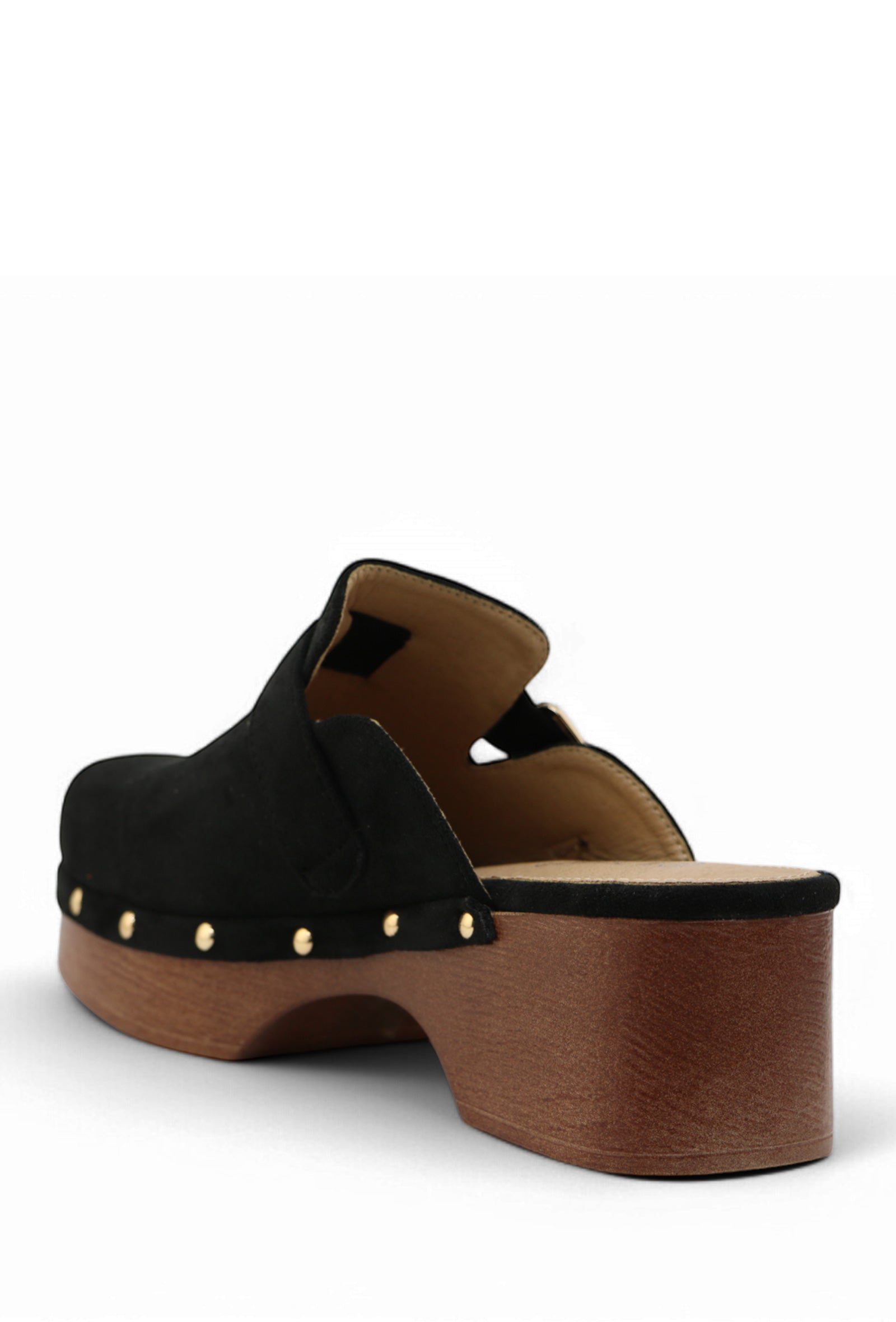 Ces mules tendance sont la pièce phare pour un style vintage assumé. Elles présentent un dessus en suédine noire douce, contrastant avec une épaisse plateforme et un talon compensé aspect bois marron. Le pourtour de la semelle est orné de clous décoratifs dorés et une boucle ardillon métallique vient rehausser le dessus. Parfaites pour être enfilées facilement, ces chaussures donneront un caractère bohème-chic à toutes vos tenues, du jean évasé à la robe midi.