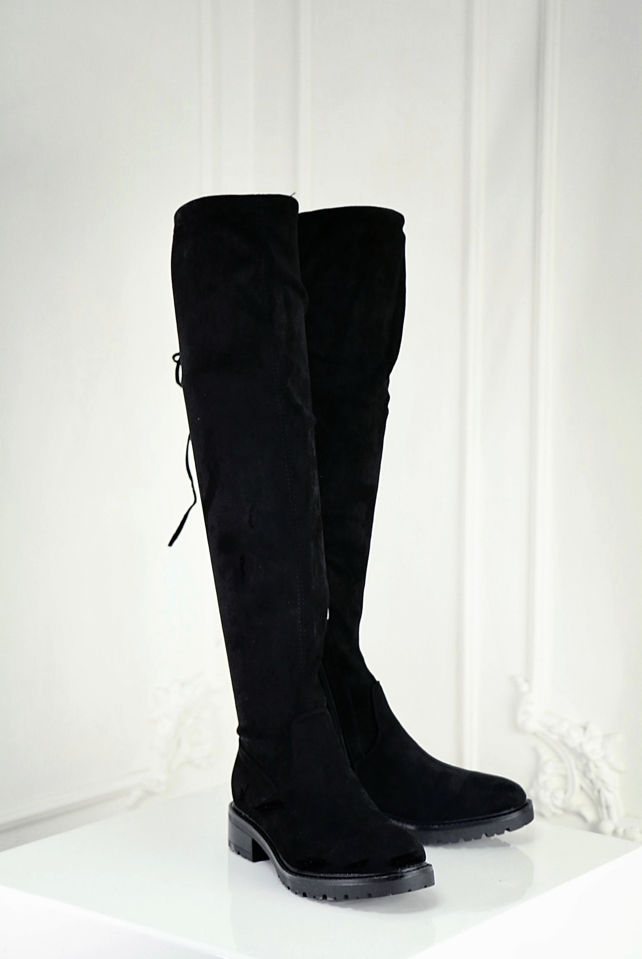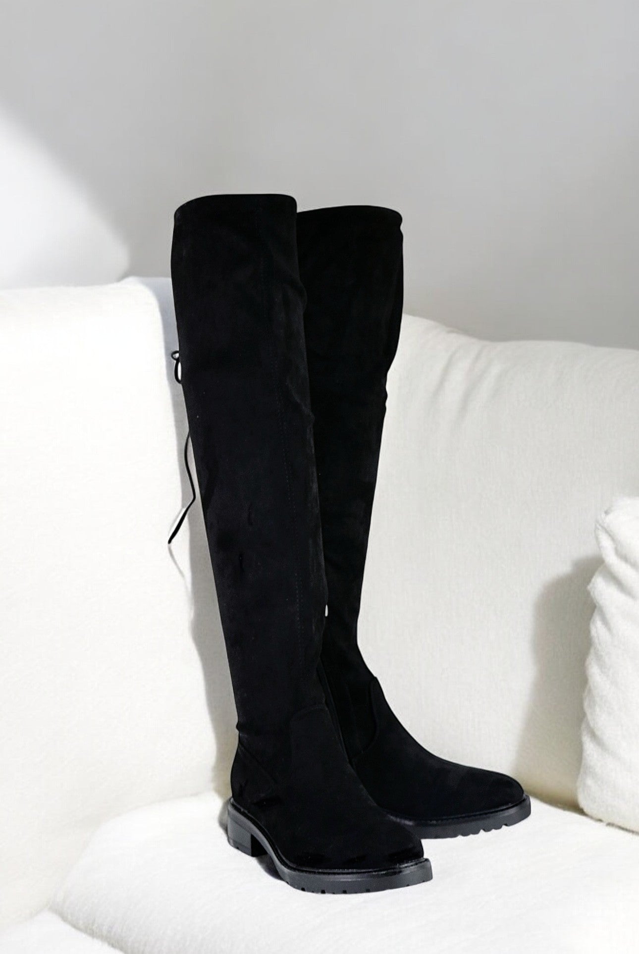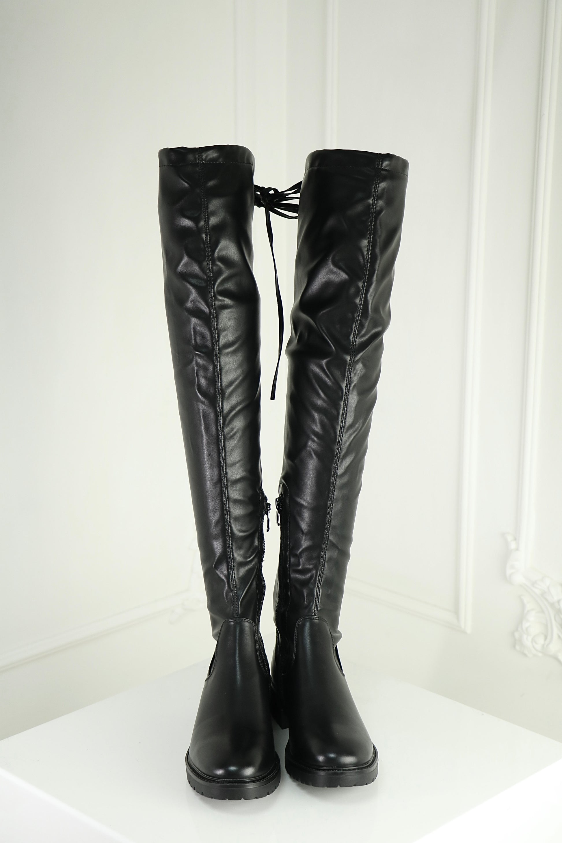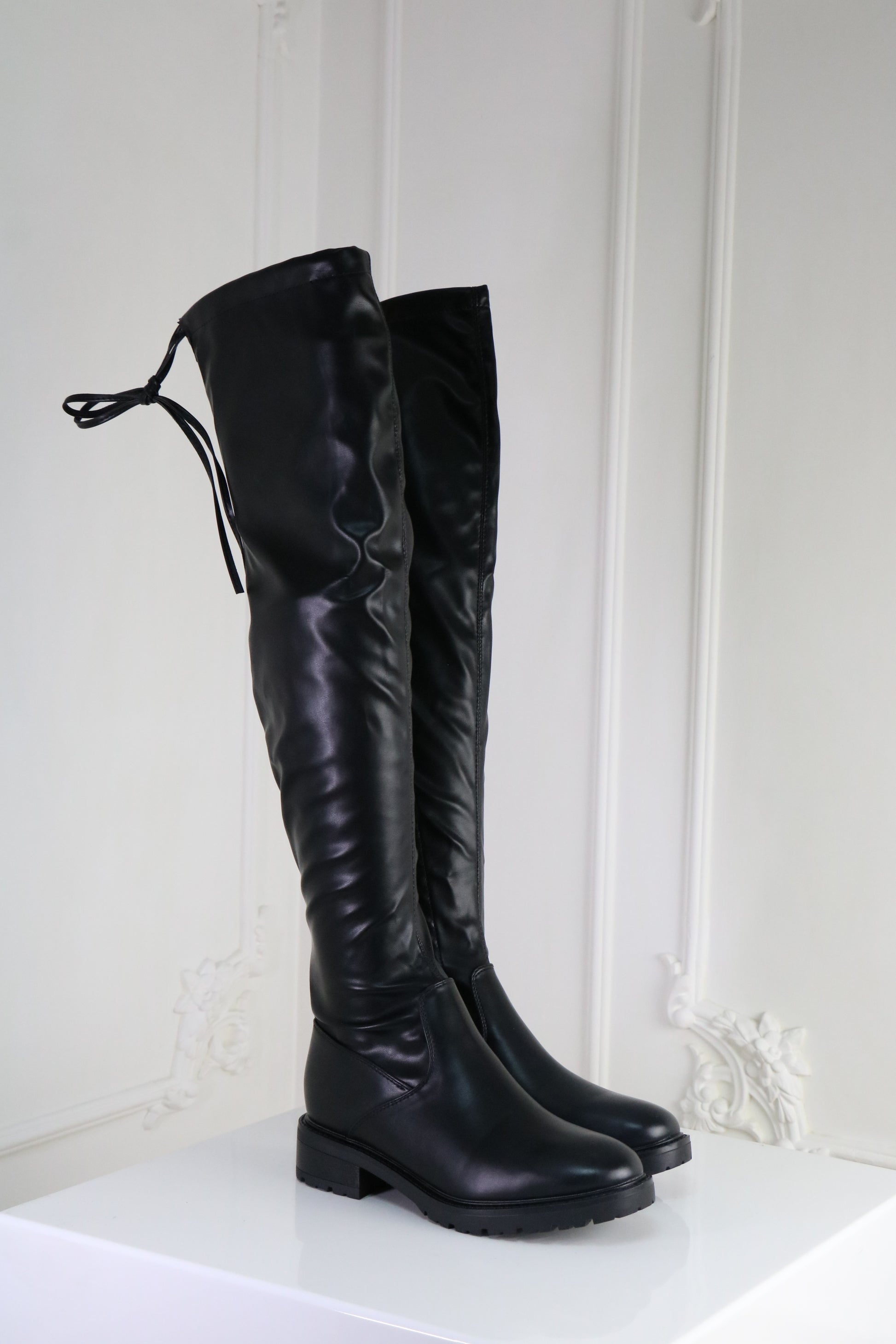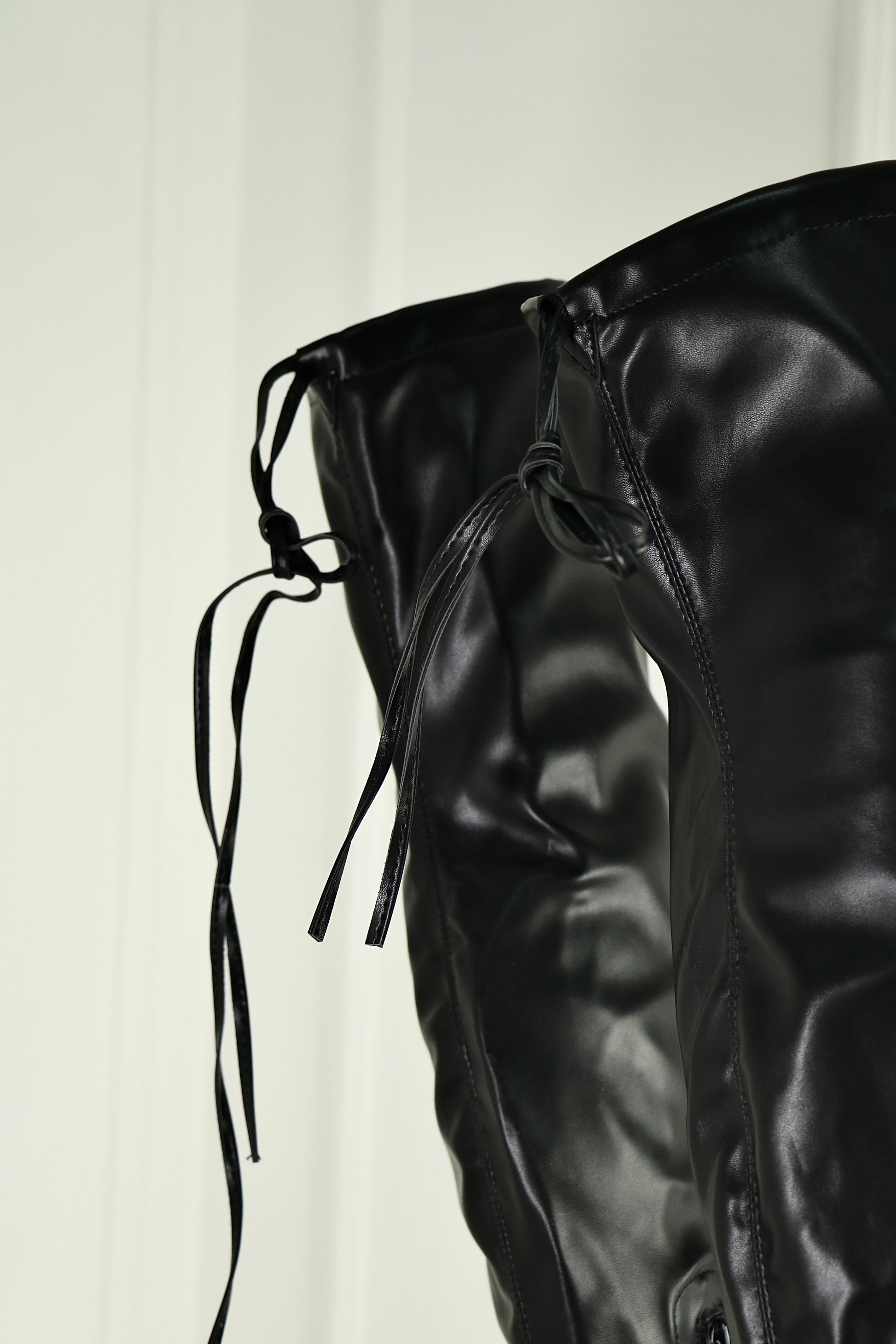 Élevez votre style avec notre cuissarde noire Belladonna. Confectionn imitation cuir, cette cuissarde allie confort et sophistication. Sa longue tige s'ajuste parfaitement à la jambe, soulignant la silhouette avec élégance.