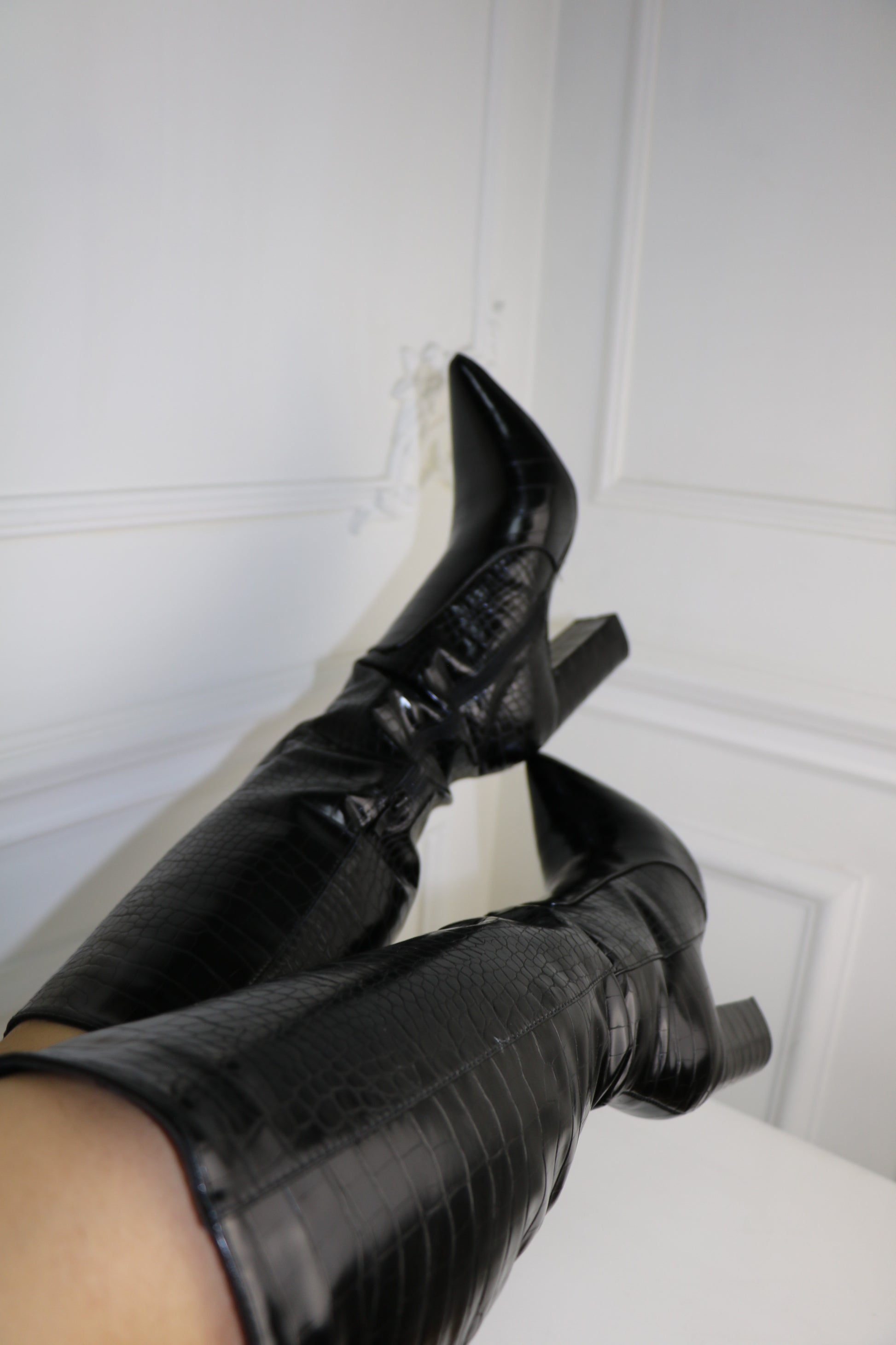 Affirmez votre présence avec les Reptilia, des bottes hautes qui captent tous les regards. Dotées de talons vertigineux de 9.5 cm et ornées d'un embossé au motif crocodile, ces bottes incarnent audace et sophistication. Leur texture luxueuse et leur silhouette sculptée confèrent une allure redoutablement chic, parfaite pour celles qui osent dominer la scène avec style.